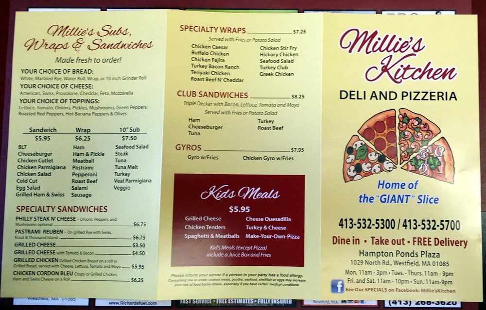 Welcome to Millies Kitchen Pizzeria, where culinary craftsmanship meets comfort food in Westfield, MA. Located at 1029 N Rd, this gem offers not just delicious pizza but a diverse menu that caters to every craving. Each bite of their signature pizzas reveals a delightful crunch, praised for not being greasy, ensuring a satisfying experience that leaves your hands clean.